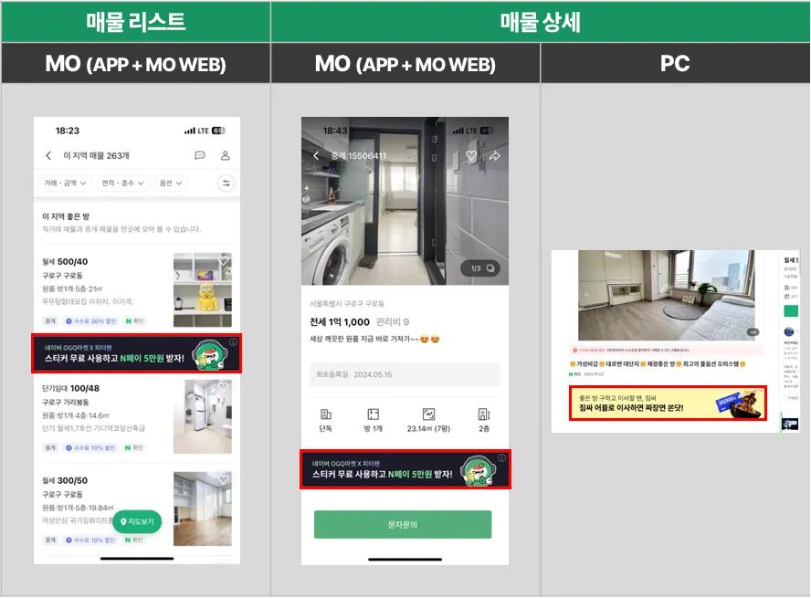유저가 매물을 탐색하고, 상세 내용을 확인하는 과정에서 배너 형태로 노출 되는 광고 지면이며