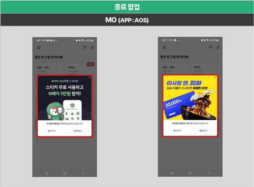 AOS 기기에서 피터팬 앱 종료 시 화면 중앙에 팝업 형태로 노출 되는 광고 지면이며 매출 탐색 or 등록 등 유저가 앱 사용 목적 충족 후 종료하는 과정에서 노출되기에 이탈은 줄이고 추가 유입을 기대할 수 있는 상품입니다.